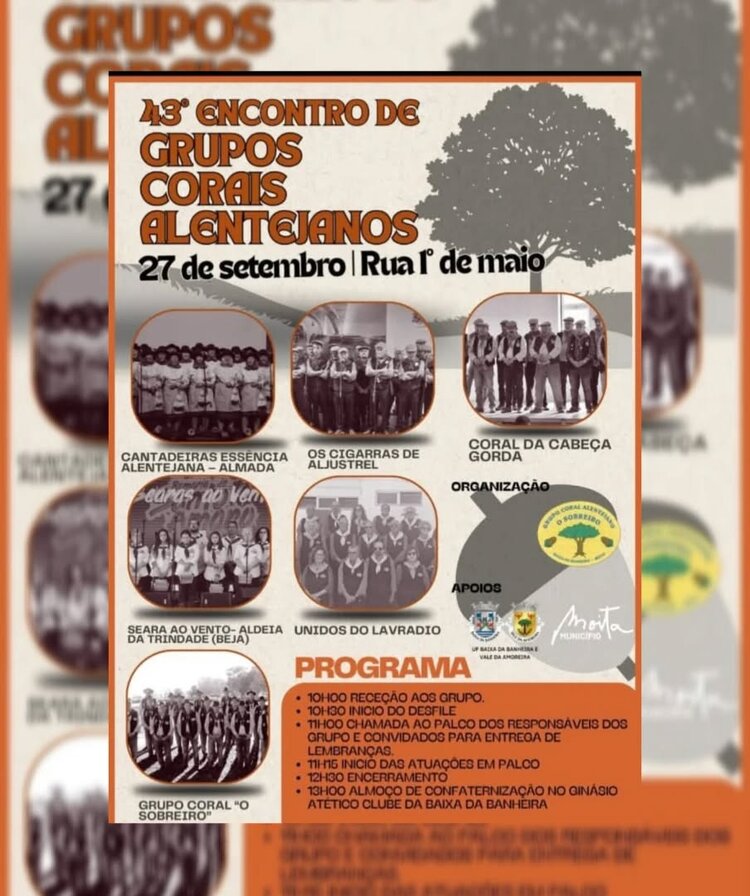 43º Encontro de Grupos Corais Alentejanos, dia 27 de setembro, sábado, na Rua 1º de Maio, Baixa da Banheira.