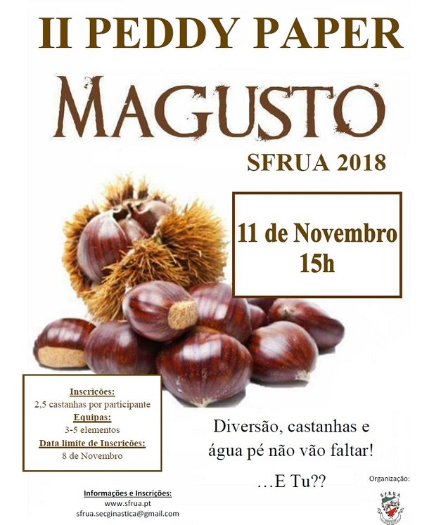 No dia 11 de Novembro, às 15h, vai realizar-se o II Magusto Peddy Paper da SFRUA, pelas ruas de Alhos Vedros (com inicio na SFRUA).