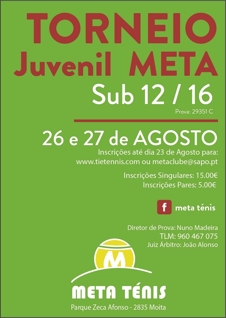 A Moita Escola de Tenis organiza nos dias 26 e 27 de Agosto de 2017 o Torneio Juvenil Meta Sub 12/16.