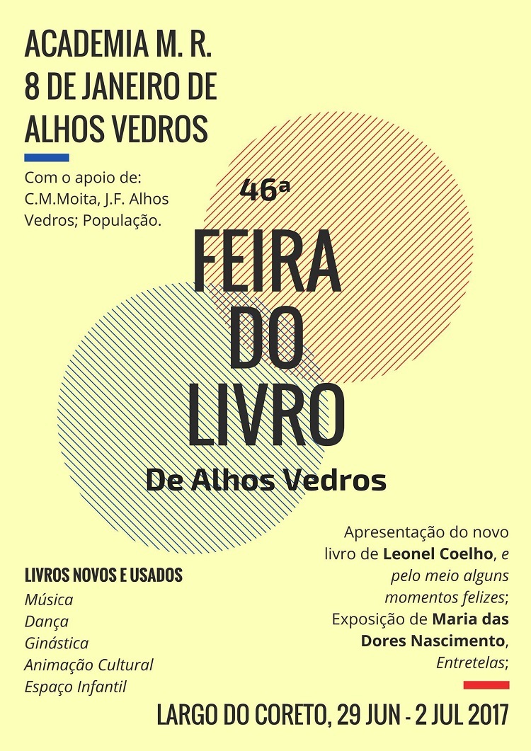 A Academia Musical e Recreativa 8 Janeiro irá realizar mais uma edição da Feira do Livro, no Largo do Coreto em Alhos Vedros, de 29 de Junho a 2 Julho, com apresentação do novo livro de Leonel Coelho "E pelo meio alguns momentos felizes" e Exposição "Entretelas" de Maria das Dores Nascimento.