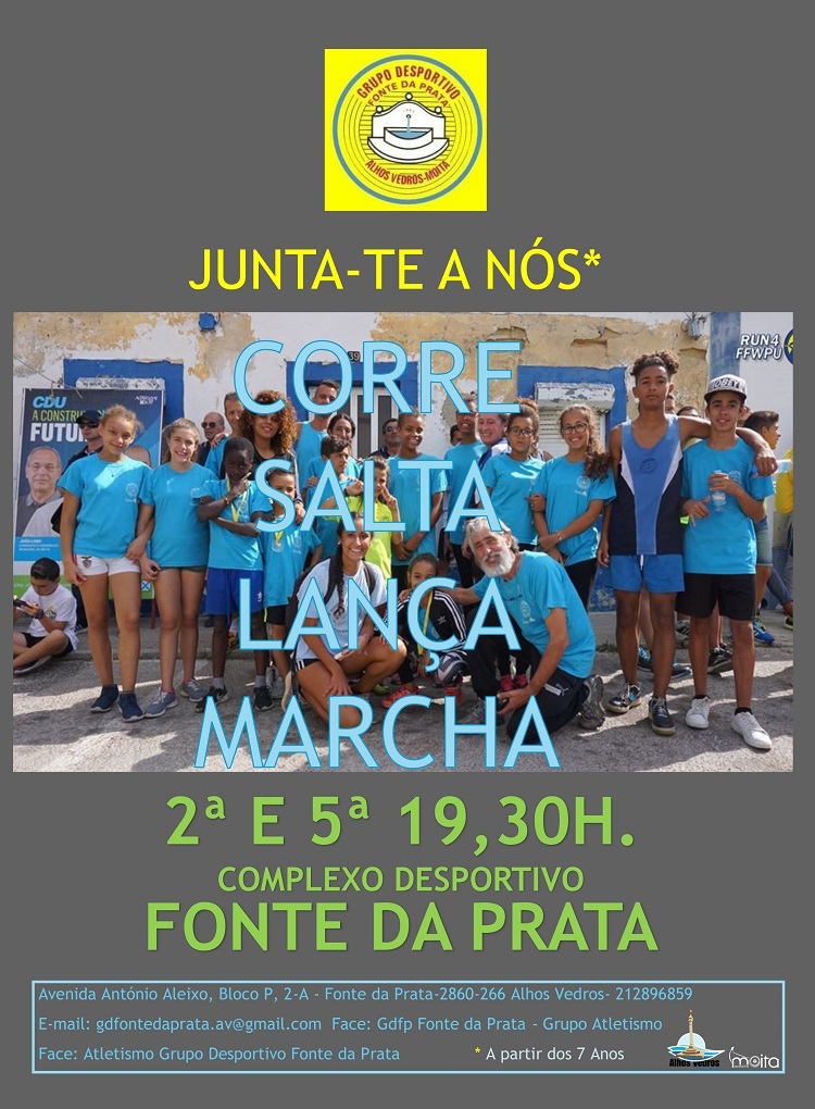 O Grupo Desportivo da Fonte da Prata, Alhos Vedros convida as crianças e jovens a partir dos 7 anos, para treinos de Atletismo, no Complexo Desportivo da Fonte da Prata.