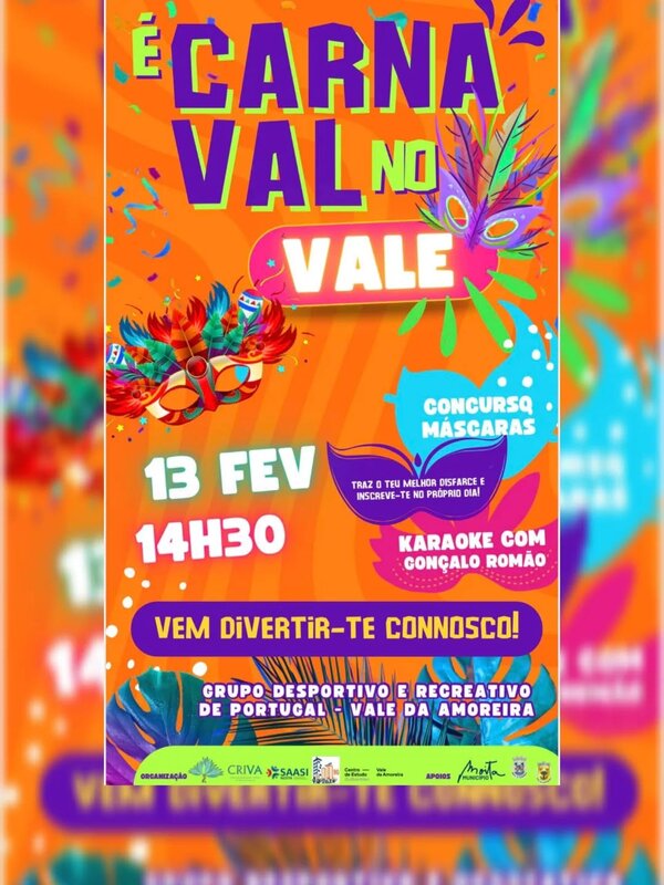 - 14h30 - É Carnaval no VALE, no Grupo Desportivo e Recreativo Portugal, organizado pelo Centro de Reformados e Idosos do Vale da Amoreira