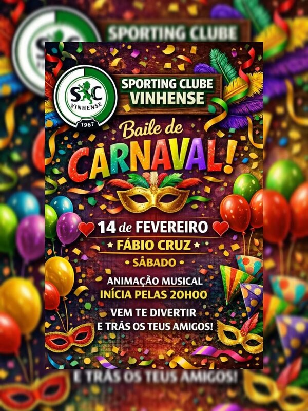 - 20h00 - Baile de Carnaval na sede social, organizado pelo Sporting Clube Vinhense.