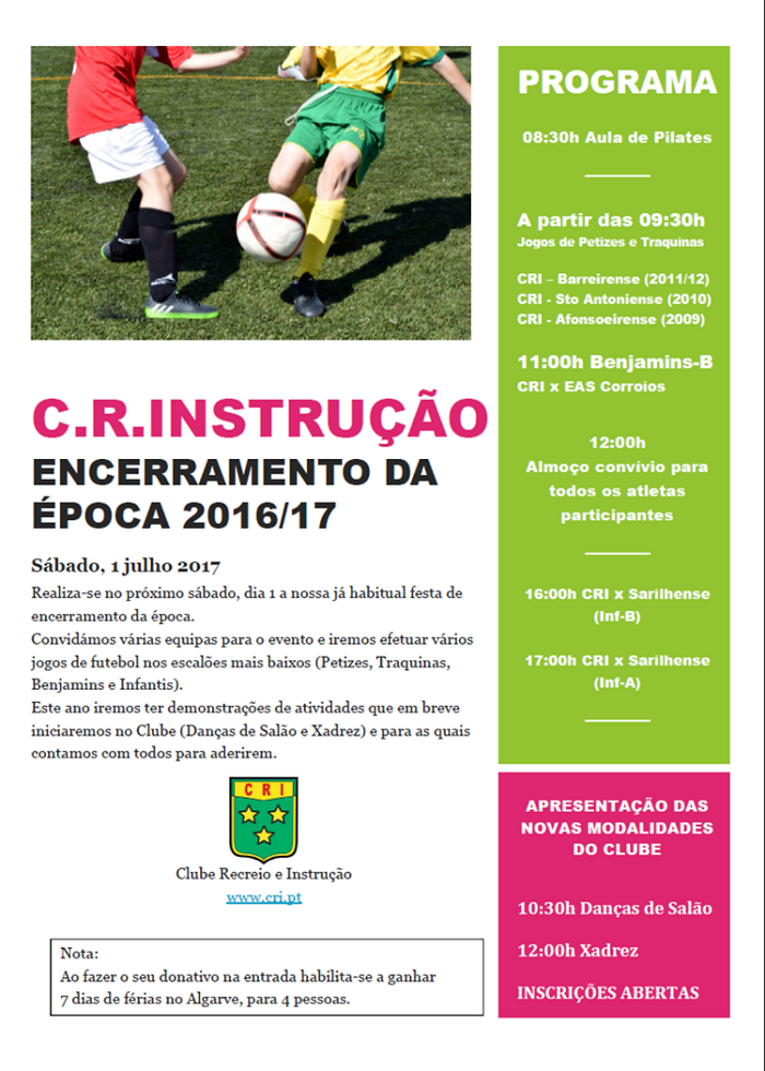 Durante todo o dia do próximo sábado - 1 julho, o Clube Recreio e Instrução irá realizar diversas actividades no âmbito do encerramento da época 21016/2017. Mais informações no cartaz.