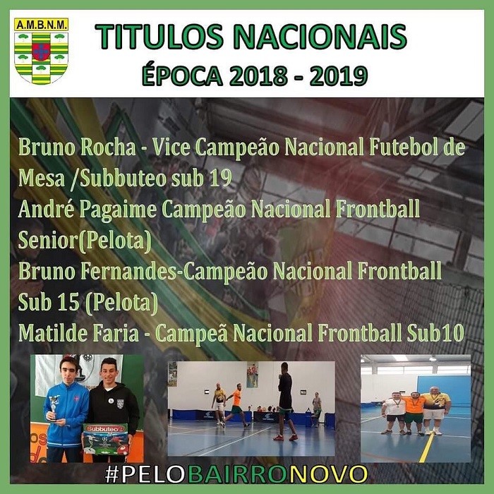 Na época desportiva 2018/2019, a Associação de Moradores do Bairro Novo obteve vários títulos nacionais, nas modalidades de Pelota, Subbuteo e FrontBall. Parabéns.